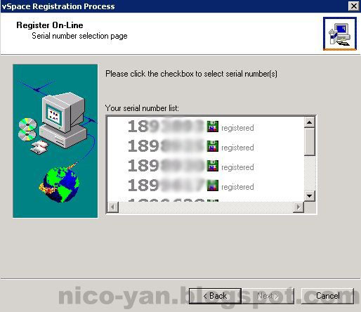 Lalu akan ditampilkan nomor seria number NComputing yang terdeteksi oleh server, bila Serial belum diregister maka akan tertera not registered bila sudah diregister akan tertera registered. Untuk saat ini pilih serial number yang belum diregister lalu tekan next. Maka program akan tersambung ke internet, tunggu sebentar lalu akan muncul status apakah registrasi berhasil atau tidak.